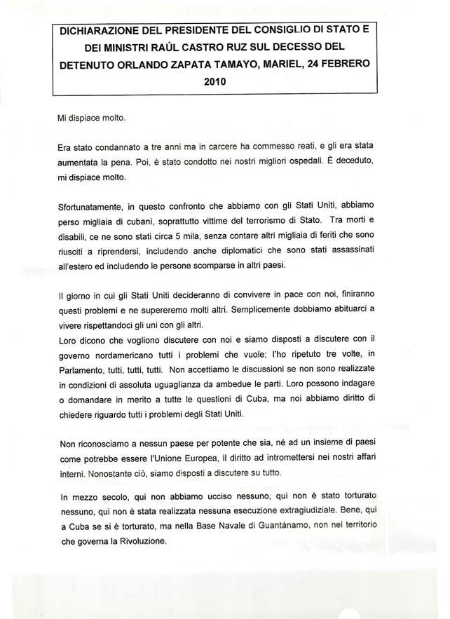 Dichiarazione del Presidente del Consiglio di Stato e dei Ministri Raśl Castro Ruz sul decesso del detenuto Orlando Zapata Tamayo, Mariel, 24 febbraio 2010