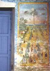 Pintura Mural: La galería y aposentos de la planta alta conservan pinturas decorativas en los zócalos de los muros, una tradición de las pasadas centurias. Ellas son testimonios que expresan gustos, modos, sentimientos, boato e historia. Las que cubren las paredes de una habitación, desde el techo al piso, son significativas: sus doce recuadros, pintados en variados colores por un artista anónimo y algo primitivista, reflejan un ambiente ciudadano dieciochesco (posiblemente entre 1762-1767), donde diversos personajes conviven en idílica armonía.