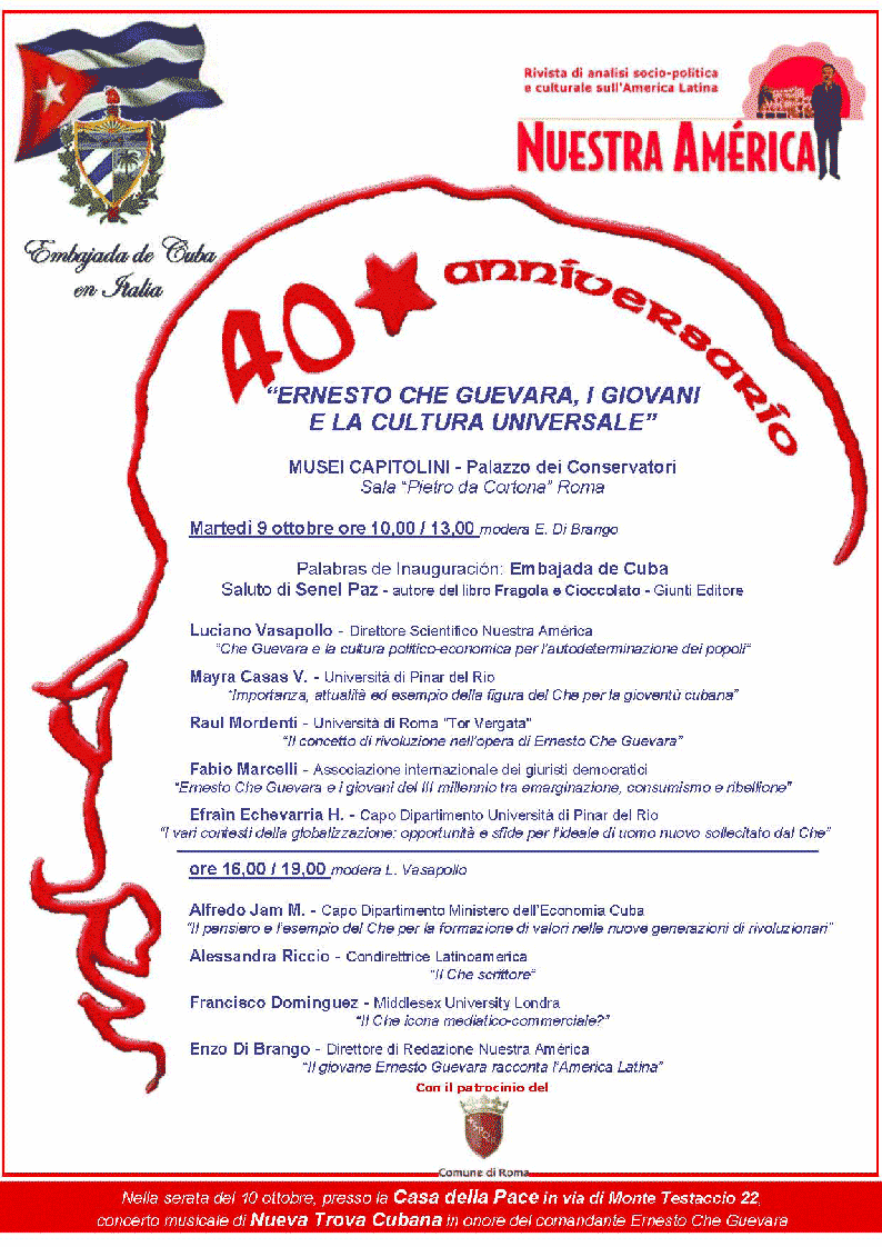 4. Ma il Che, per la sua ispirazione internazionalista e la solidità dei suoi fondamenti etici ed ideali, rappresenta oggi al tempo stesso una figura guida per l'insieme del pianeta e particolarmente per i giovani. Il suo universalismo, basato sulla solidarietà di classe e la necessità di una lotta comune, può costruire uno strumento formidabile per ricostruire, a livello sia ideologico che pratico, uno schieramento democratico e rivoluzionario adeguato che sappia operare nell'ambito della globalizzazione. Ne consegue l'urgenza di un'opera pedagogica e di approfondimento analitico rivolta e praticata in particolare dalle giovani generazioni che costituiscono per quanto detto le principali vittime dell'attuale situazione.