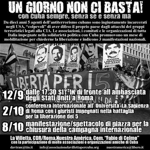 - Una conferenza internazionale con la partecipazione di giuristi internazionali impegnati nella battaglia per la libertà dei 5 da tenersi all'Università La Sapienza di Roma il 2 ottobre.