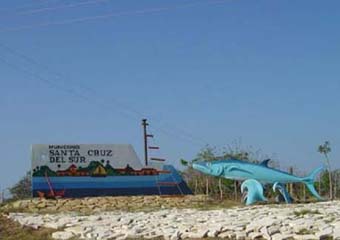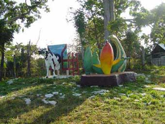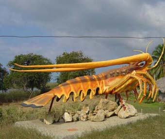Pero no se ha limitado a reflejar solo la fauna marina, sino también los frutales, la ganadería… Pero lo que más llama la atención de visitantes y residentes son una langosta, un camarón y un delfín; todos de gran dimensión que se encuentran en la principal carretera santacruceña…
