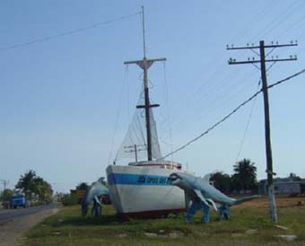 En la valla de la división de Santa Cruz del Sur está también la mano de este escultor-artesano y en otros parajes de la geografía del sureño municipio camagüeyano… Una Sierra de DOS toneladas de peso y seis metros de diámetro, que muestra al viajero el camino de acceso al principal puerto pesquero de la provincia, embellece el entorno.