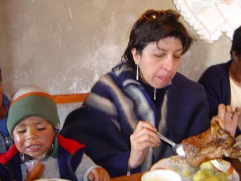 Una familia indígena (Beatriz Punina y Efraín Ramírez) nos invita, en el Lindero, a un almuerzo abundante y variado: un caldo con medio pollo en cada plato, una salsa blanca, patatas y conejillo de india o cuyes asado.