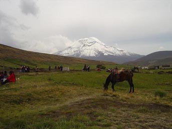 El Chimborazo, nos regala una vista templada. En el valle de Río Colorado, concluye este recorrido. Los indígenas sueltan sus corceles para que pasten. No puedo dejar pasar la combinación naturaleza-hombres-animales. En primer plano, los indígenas y los caballos, y en el horizonte una vista casi perfecta del Chimborazo cubierto, en la misma puerta del sol, de una manta espesa de nieve que le imprime al volcán una belleza inigualable.