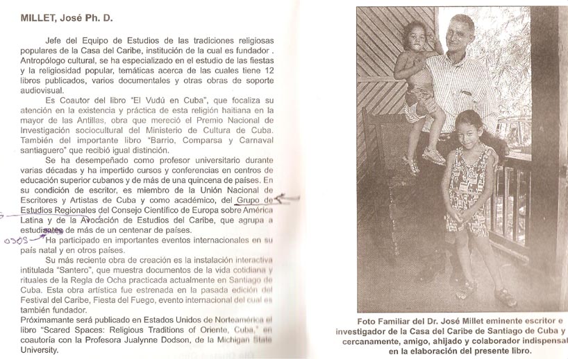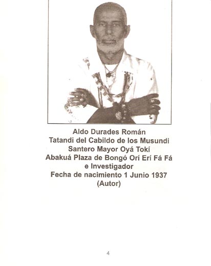 Una vieja amistad me ata a Aldo, en cuya prenda tomé sombra a raíz de la muerte de mi padrino en esta religión, el Tata Nkise Vicente Portuondo Martín, de la familia religiosa de los Brama con Brama, del Tata Nkise matancero Reynerio Pérez, establecido en Santiago de Cuba a principios del siglo XX. Mi participación en la confección del Llanto por un brujo se ha limitado a escuchar, tratar de transcribir y redactar en un lenguaje sencillo lo que el Tatandi de los Musundi me ha dictado durante un tiempo en que hemos concentrado nuestros esfuerzos para poner a disposición de nuestro pueblo este rico legado cultural que debería ser propuesto a la UNESCO, y de hecho lo estoy haciendo aquí en mi condición de investigador y escritor, para engrosar su listado de Patrimonio Intangible de la Humanidad.