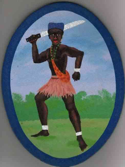 Pieza artística religiosa alegórica a Oggún Autor anónimo. Pintura sobre madera. Forma ovalada. Tamaño aproximado: 23x16,7 cm Colección Nobili/Saviola, Roma, Italia