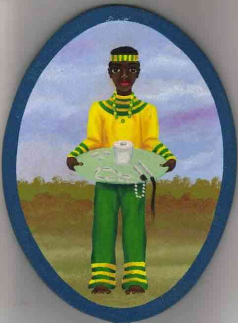 Pieza artística religiosa alegórica a Orula Autor anónimo. Pintura sobre madera. Forma ovalada. Tamaño aproximado: 23x16,7 cm Colección Nobili/Saviola, Roma, Italia
